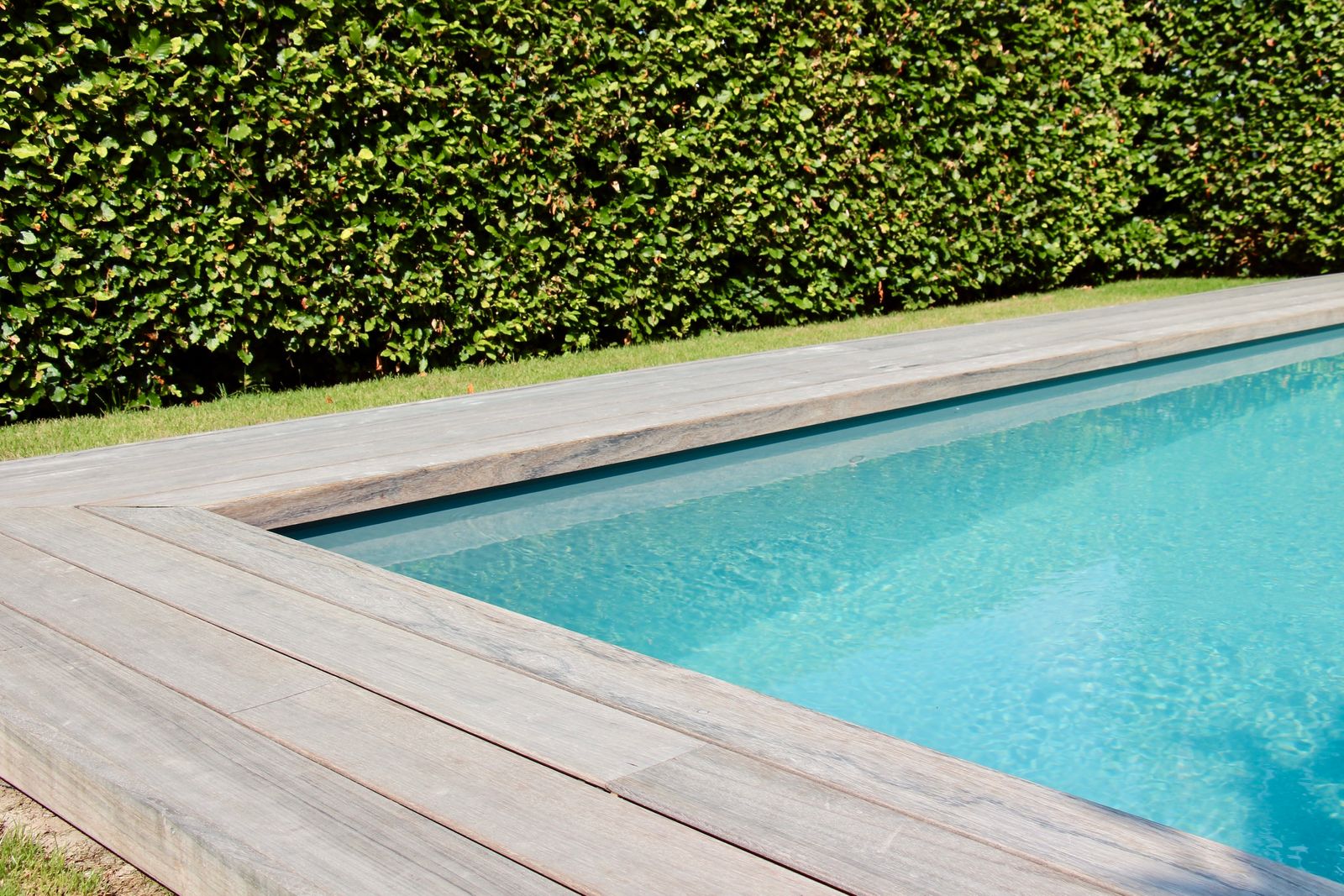 Dit hoogwaterlijn zwembad in lichtgrijs combineert strak design met oog voor detail. Het wordt omringd door een terras in padoek, waarbij de boordplank eigenhandig werd verzaagd en uitgevoerd in verstek en verlijmd naar nulverstek. Dankzij deze verfijnde afwerking sluit het hout naadloos aan en ontstaat er een strak, minimalistisch geheel dat de pure lijnen van het zwembad extra benadrukt.