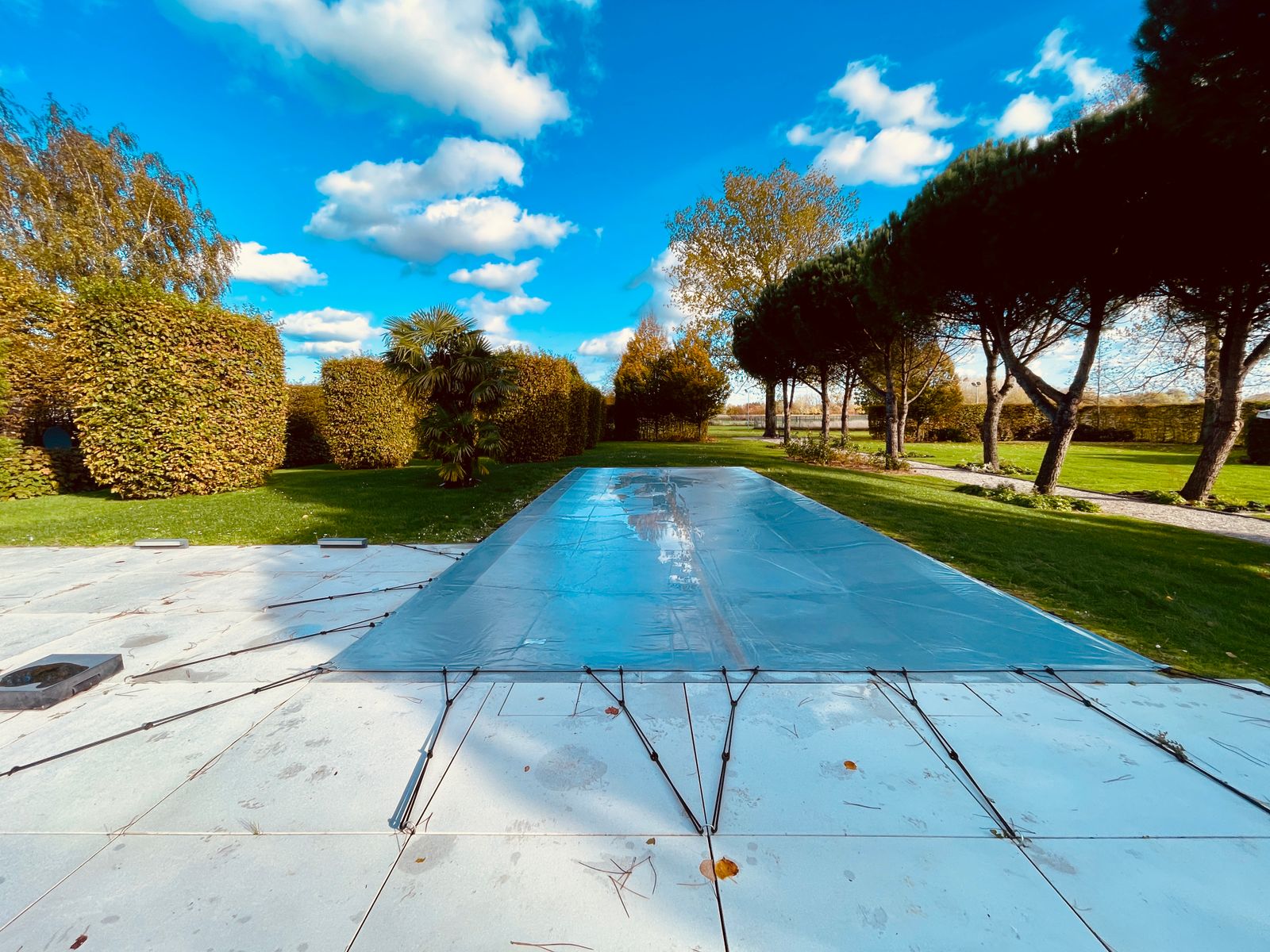 Een wateroppervlak zo glad als glas, omringd door groen dat in het blauw weerspiegelt – dit zwembad…